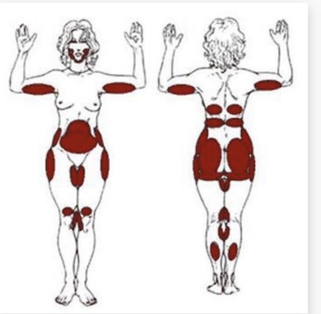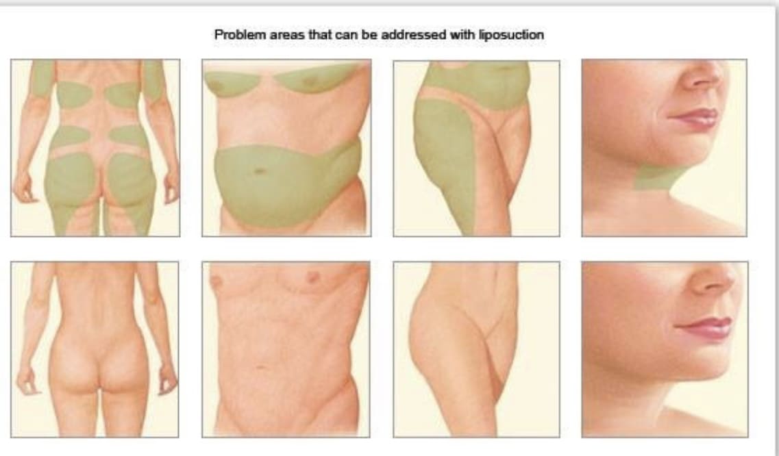 на внешней стороне бедер «галифе», области коленей, нижней трети голеней, ягодицах и в районе подбородка. Реже проблемными зонами являются «климактерический горб» (область задней поверхности нижней части шеи), щеки и другие зоны лица, предплечья и плечи, спина. У мужчин наиболее часто проблемными зонами являются подбородочная область, передняя поверхность грудной стенки, живот.